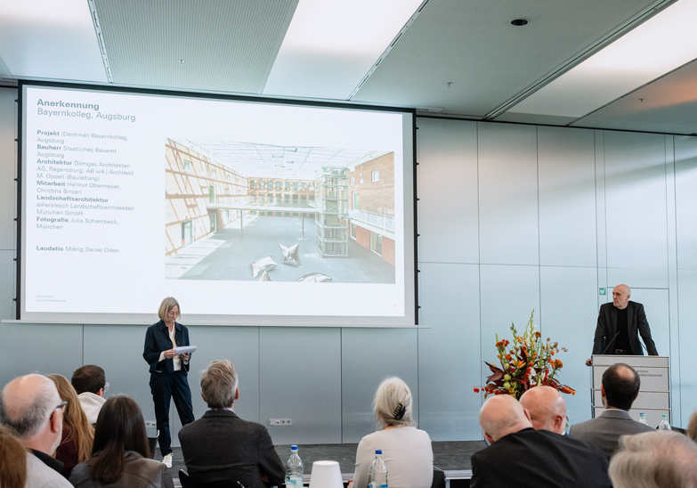 Die Jury wurde von Reiner Nagel, Vorstandsvorsitzender der Bundesstiftung Baukultur, geleitet. Überreicht wurden die Auszeichnungen von Vertreter:innen der Kammer, begleitet von einer Videobotschaft des Bayerischen Staatsministers für Wissenschaft und Kunst, Markus Blume.
