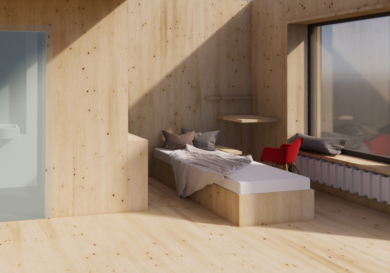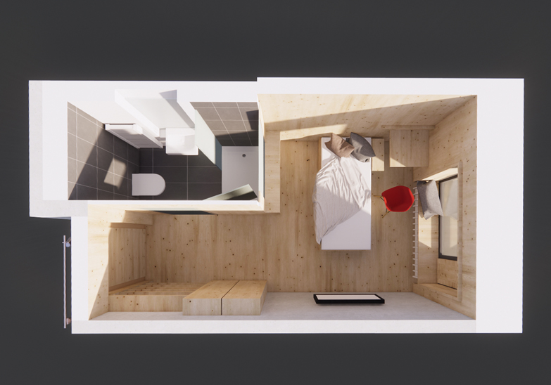 Die 60 Badeinheiten der Gästezimmer sind als vorgefertigte Raummodule konzipiert und ermöglichen eine wirtschaftliche Errichtung des Gebäudes. Jeweils zwei Bäder liegen Rücken an Rücken und teilen sich einen gemeinsamen vertikalen Erschließungsschacht. Die Raummodule können zu 100% vorgefertigt auf die Baustelle gebracht werden und bilden in sich abgeschlossene Raumzellen, welche lediglich noch an die Hauptleitungen der TGA anzuschließen sind.