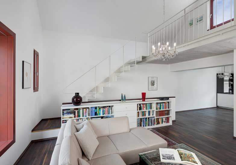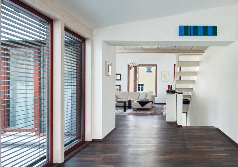 Der hölzerne rückwärtige Anbau nimmt die Sprache der Schuppen und Lager-gebäude der traditionellen Handwerkshäuser auf und schaff t eine intime private Atmosphäre mit Freisitz zum Wohnen.