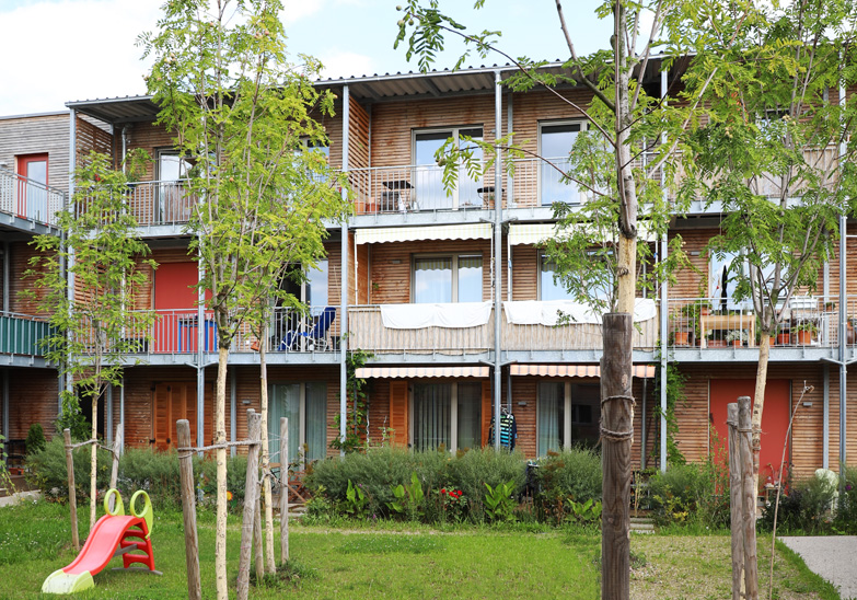 Die selbstragenden Außenwände des Gebäudes sind in Holzrahmenbauweise mit Zellulosedämmung erstellt. Die horizontale Schalung aus unbehandelter heimischer Douglasie und großzügigen Fenstern prägen die Fassade. In den Räumen sowie dem Laubengang liegt Parkettboden. Diese durchgängige Materialität ist das verbindende Element und betont die Idee des genossenschaftlichen Wohnungsbaus. Rote Faserzementplatten und Eingangselemente setzen farbliche Akzente. Das flachgeneigte Dach des mittleren Riegels ist begrünt und dient als Erholungsfläche. Auf den anderen beiden Dächern sichern Photovoltaik- und Solarthermie-Elemente in Kombination mit dem Blockheizkraftwerk den Strom- bzw. Wärmebedarf.