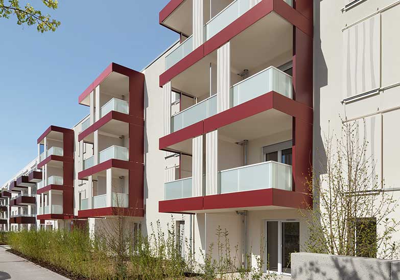 Entstanden ist mit Bauabschnitt 3 in der Plato-Wild-Straße ein winkelförmiger Baukörper mit vier Geschossen. Er fügt sich mit seinem Volumen der Umgebung, setzt aber mit seinen Gestaltungselementen und seiner Farbgebung bewusst gewählte Akzente. Die Fassade übernimmt den cremefarbenen Putz und die Intarsienstruktur aus Bauabschnitt 1 und 2, um den Ensemblecharakter zu unterstreichen. Mit dem intensiven Rot für die Loggien und Treppenhäuser reagiert das Gebäude auf den direkt angrenzenden Nachbarn im Norden. Alle Zugänge und Verkehrsflächen sind barrierefrei und großzügig ausgelegt, auch Abstellflächen für Rollstühle sind vorhanden.